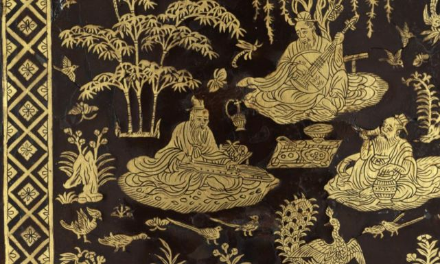 唐代的漆器种类繁多,不仅有素髹、描漆,更有金银平脱、螺钿、密陀绘、末金镂等华丽技法。金银平脱源自汉代金银薄贴花工艺,盛行于唐五代,工匠将金银饰片剪成各种图案,镂刻花纹后贴在漆胎上,涂漆磨出,尽显奢华。正仓院中著名的金银平脱琴,琴身正面和背面都用金银做出各种生动纹饰,有南北朝时期文人高山弹奏乐器的场景,还有流水、花草相伴,侧面也有精美纹饰,令人赞叹。
